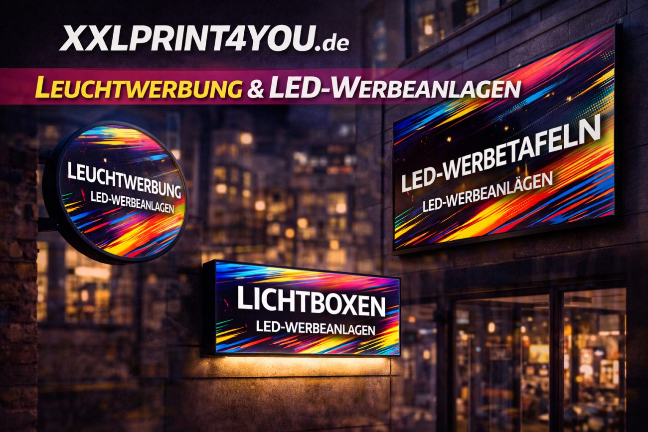 Wir entwickeln und produzieren Leuchtwerbung in unterschiedlichen Ausführungen, darunter LED-Werbeanlagen, Leuchtkästen, hinterleuchtete Schilder und Lichtwerbung für Innen- und Außenbereiche. Gestaltung, Größe, Lichtfarbe und Befestigung werden individuell auf Gebäude, Sichtweite und Corporate Design abgestimmt. Auf Wunsch übernehmen wir auch die komplette Montage und Inbetriebnahme.