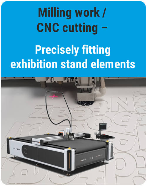 In addition to printing, we provide CNC routing and cutting services for rigid materials. You receive finished trade fair components, precisely manufactured and ready for installation.