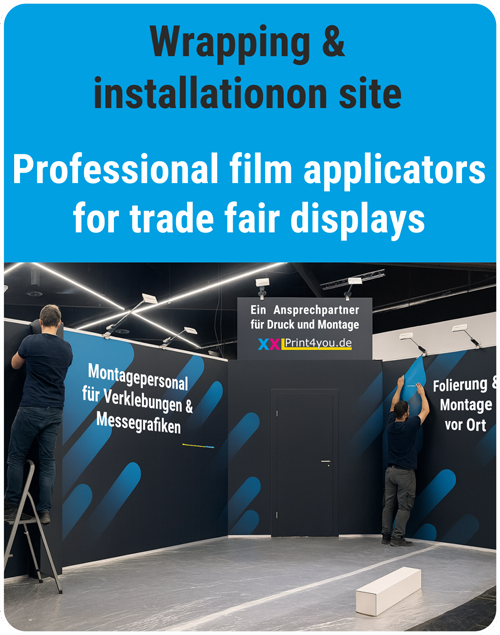 Our installation teams handle the professional application of your printed media directly at the exhibition stand. Precise execution, clean edges and reliable scheduling – even under tight trade fair conditions.