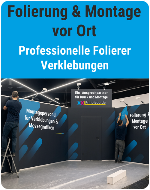 Unsere Montageteams übernehmen die fachgerechte Verklebung Ihrer Druckmedien direkt am Messestand. Präzise Ausführung, saubere Kanten und terminsichere Umsetzung – auch unter Messebedingungen.